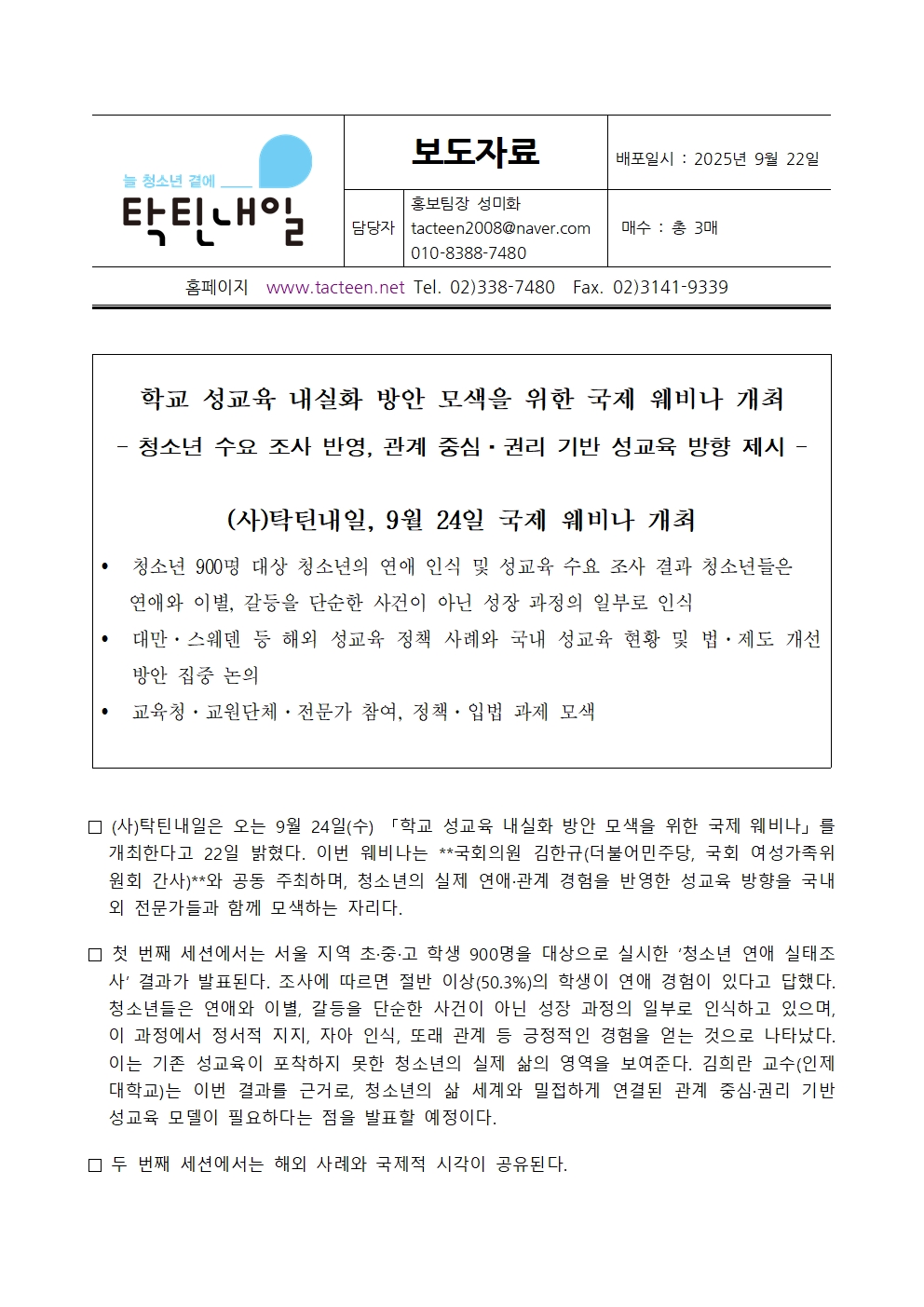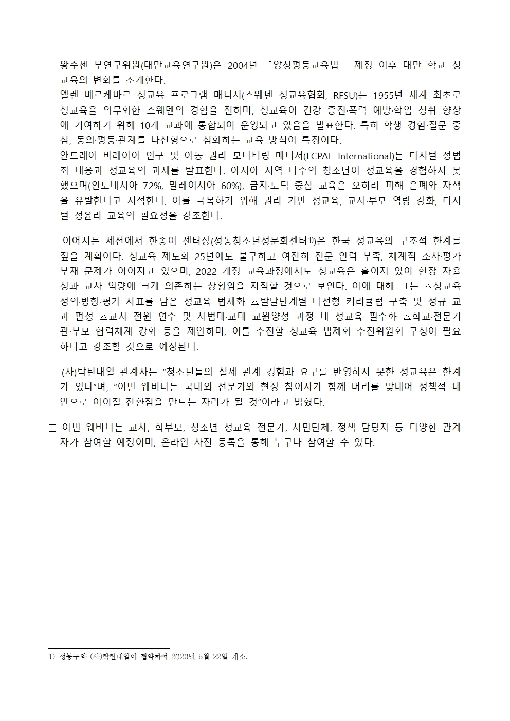 학교 성교육 내실화 방안 모색을 위한 국제 웨비나 개최
